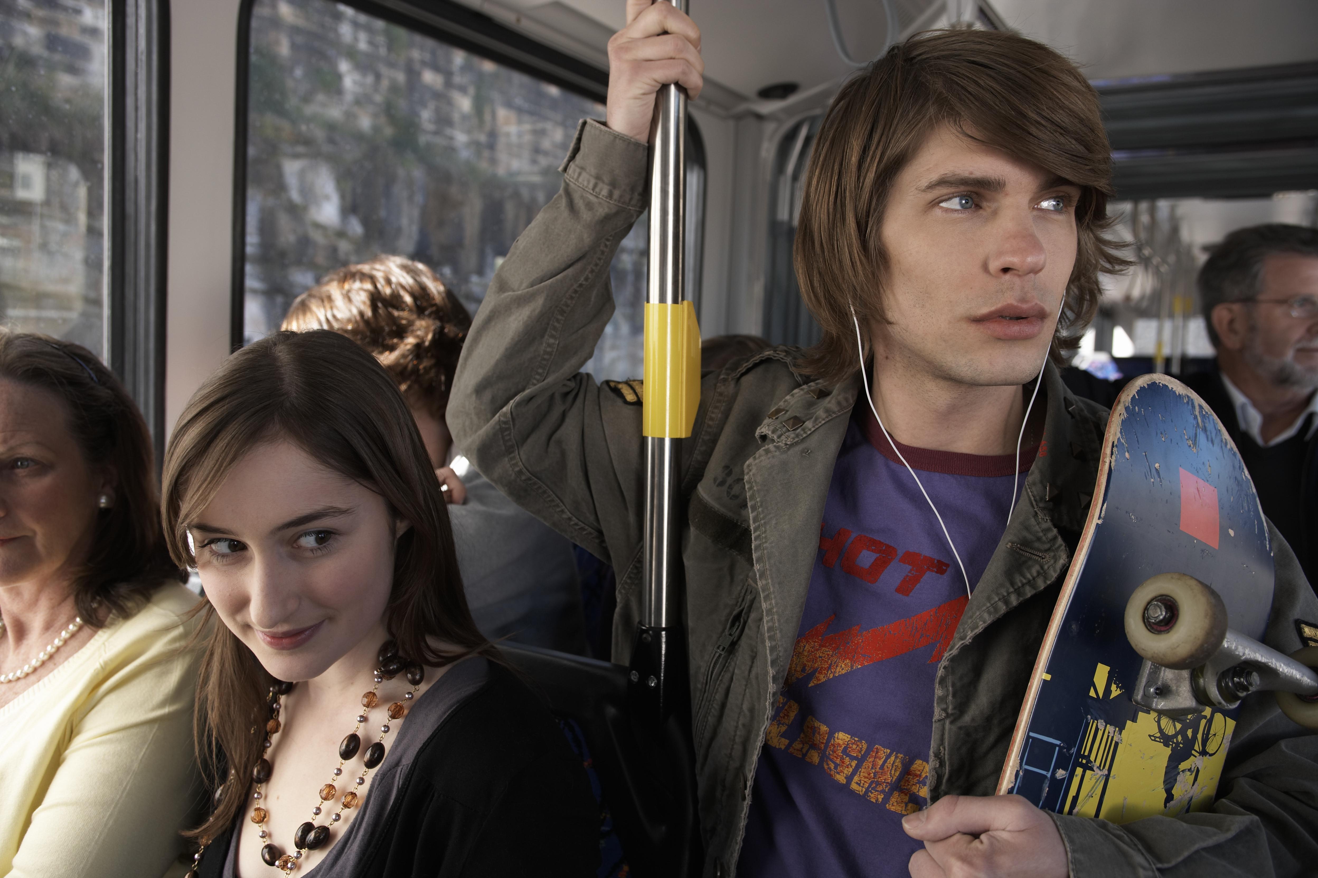 Young man holding onto railing on bus